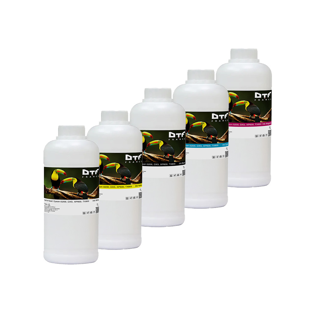 Profiteer van de beste DTF-aanbieding van het moment met deze complete set van 5 liter professionele DTF-inkt. Deze bundel bevat de vier basiskleuren CMYK (Cyaan, Magenta, Geel, Zwart) plus dekkend wit. Een voordelige en praktische oplossing, perfect om DTF-printen te ontdekken of je inktvoorraad volledig aan te vullen.